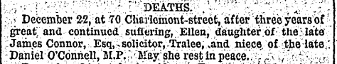 She died unmarried at 70 Charlemont St, Dublin, 22 Dec 1859, age 66 yrs.