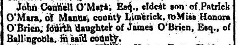 There is a Patrick O'Mara of Co.Limerick, with wife Connell (or O'Connell).