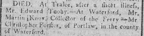 She died Sun 7 May 1809, Tralee, age 84 yrs.