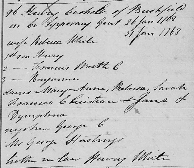 Notes on the lost will of Henry Cashell, proved 1763.