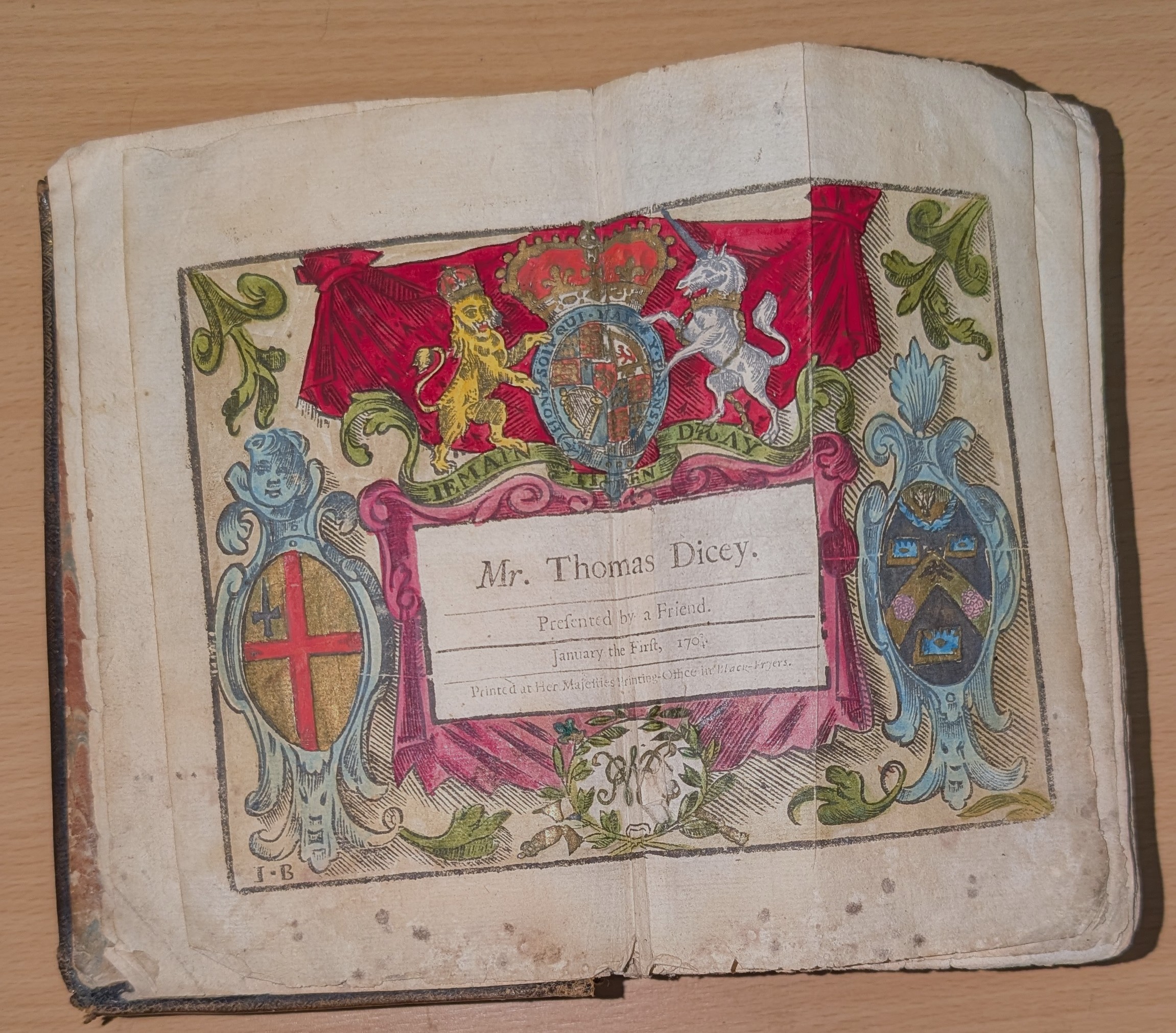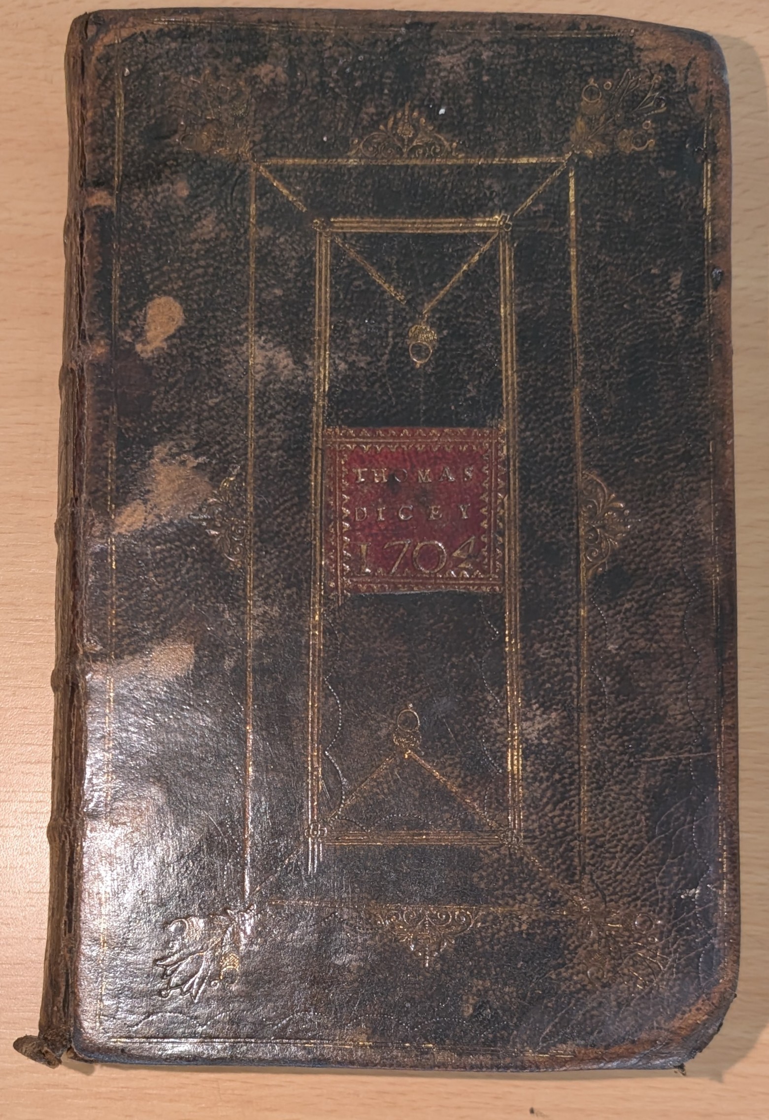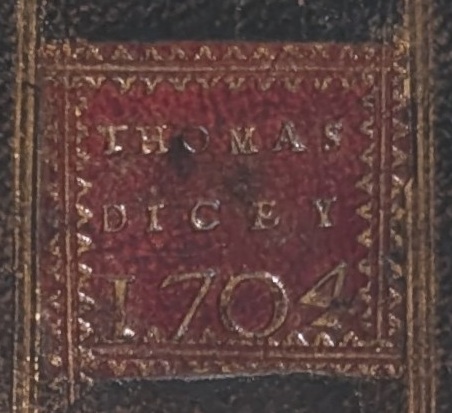 The book is presented to "Thomas Dicey" by "a friend" on 1 Jan 1704 (new style year).