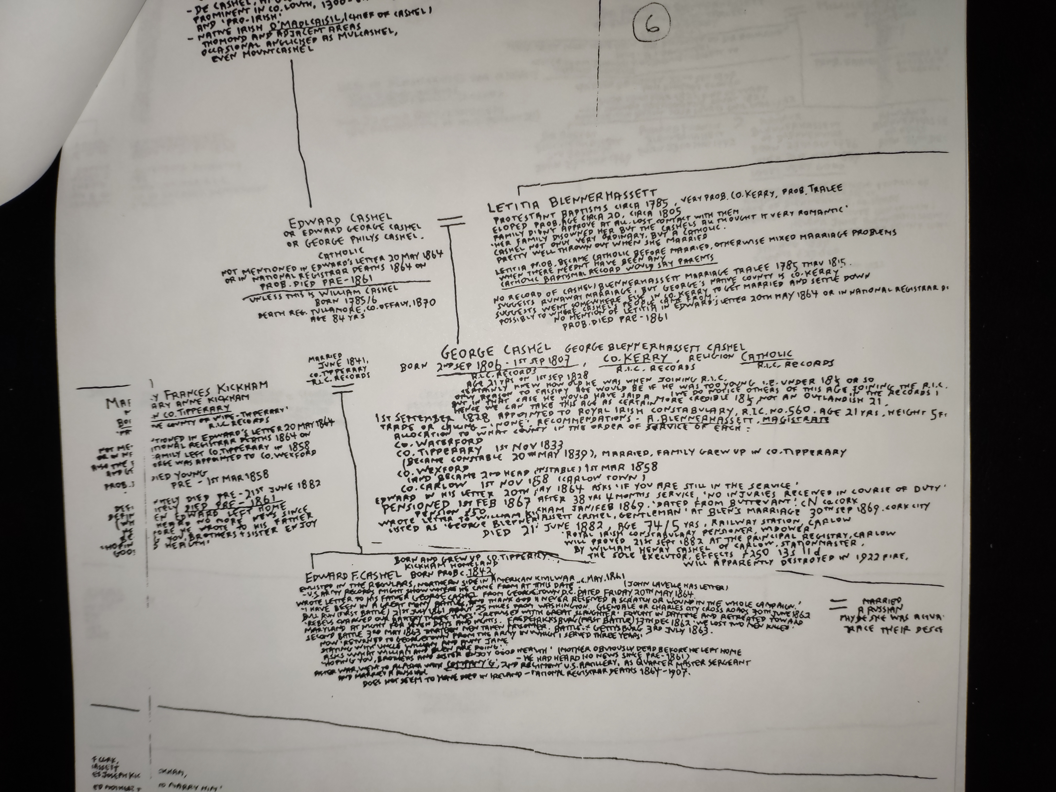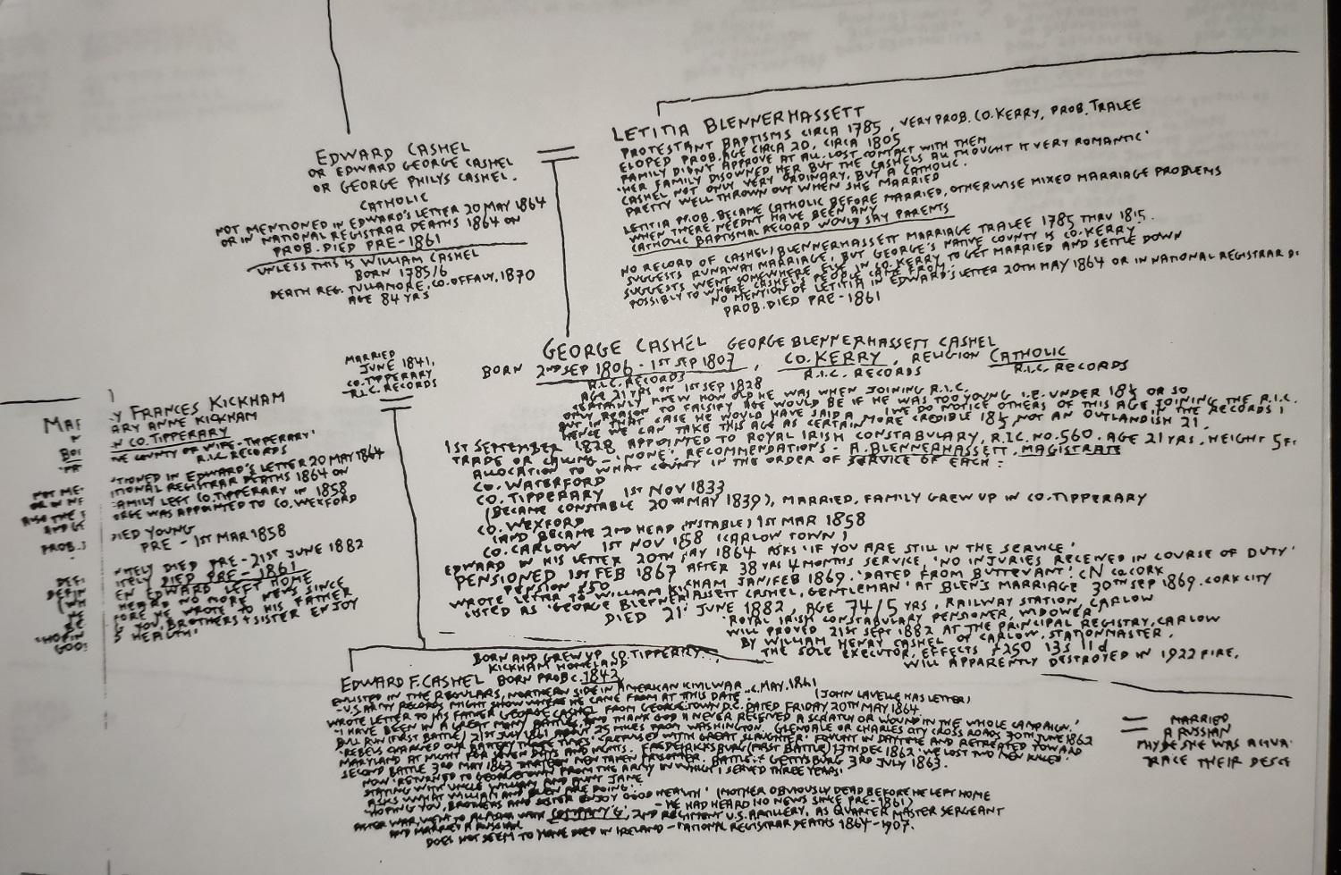 My hand-drawn family tree in 1985 to 1989, trying to work out the George Cashel ancestry.