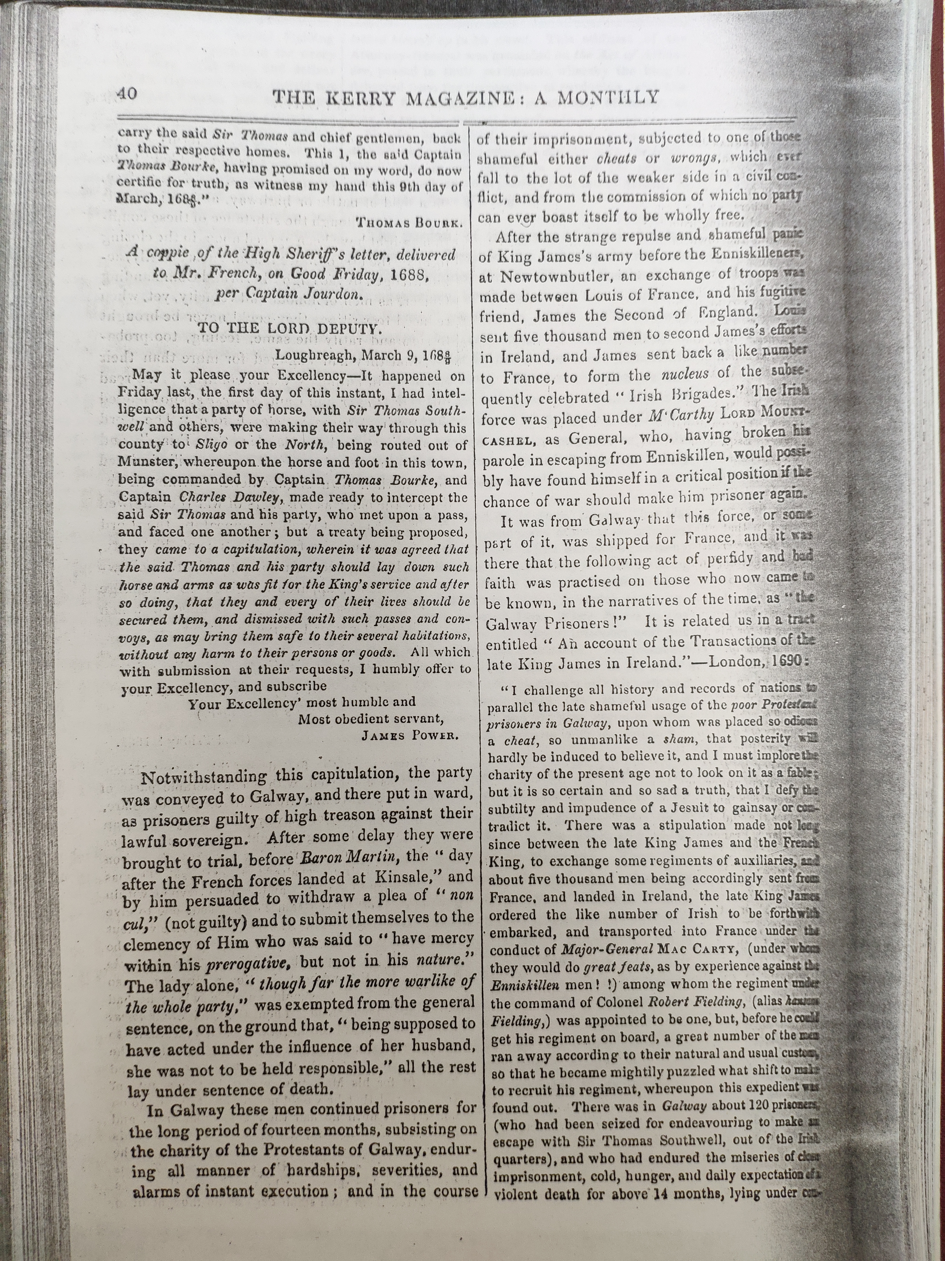 "Capt. John Blennerhassett" was a supporter of William of Orange in the Williamite-Jacobite War (1689-1691). He was captured at Loughrea, Co.Galway, 1 Mar 1689 [new style year, at the time regarded as the end of 1688]. He was imprisoned at Galway and Dublin with his brother Thomas in 1689-1690. They were imprisoned first at Galway. He is believed to have started writing down the Blennerhassett family tree in prison in Galway in 1689. Transferred to prison in Dublin after 14 months (May 1690). Finally released after Battle of the Boyne July 1690. |