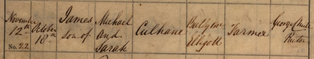 Baptism of James Culhane, 1855 [Ballymacelligott and Ballyseedy CoI par records].