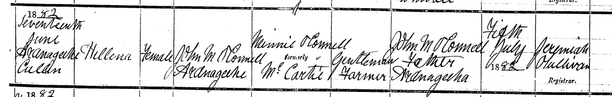 She was born "Hellena O'Connell", 17 June 1882, Ardnageeha, Co.Cork.