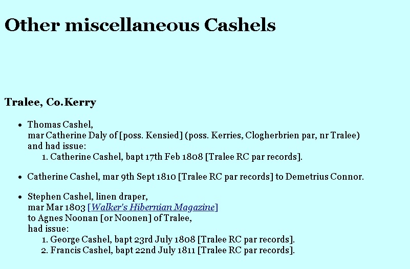 the common ancestor must be through either George Cashel (Co.Kerry) or his wife (Co.Tipperary).