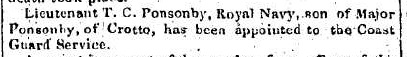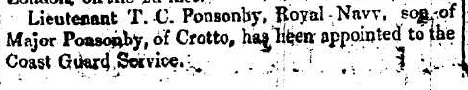 He inherited the family home of Crotto, Co.Kerry, in Dec 1831 when his father died. There is a letter of 23 Jan 1832 from Thomas C. Ponsonby, Crotto, in Ms. 20,602 in [Rowan Papers]. Black border since father just died. Thomas was party to Louisa Ponsonby's mar settlement 1833. See Sir John Benn-Walsh's visit to Crotto, 1834. Benn-Walsh says Thomas "was in the navy but left it & married on coming to this fortune, which is in fact a mere nominal thing, as it is eaten up with debts & charges. He seems a complete specimen of the embarrassed, broken down Irish squire". Benn-Walsh says that the Crotto estate "is shortly to be sold under a decree of the court to pay off numerous charges upon it." Ponsonby tried to interest Benn-Walsh in buying it. He proposed various schemes of purchase but Benn-Walsh was sceptical.