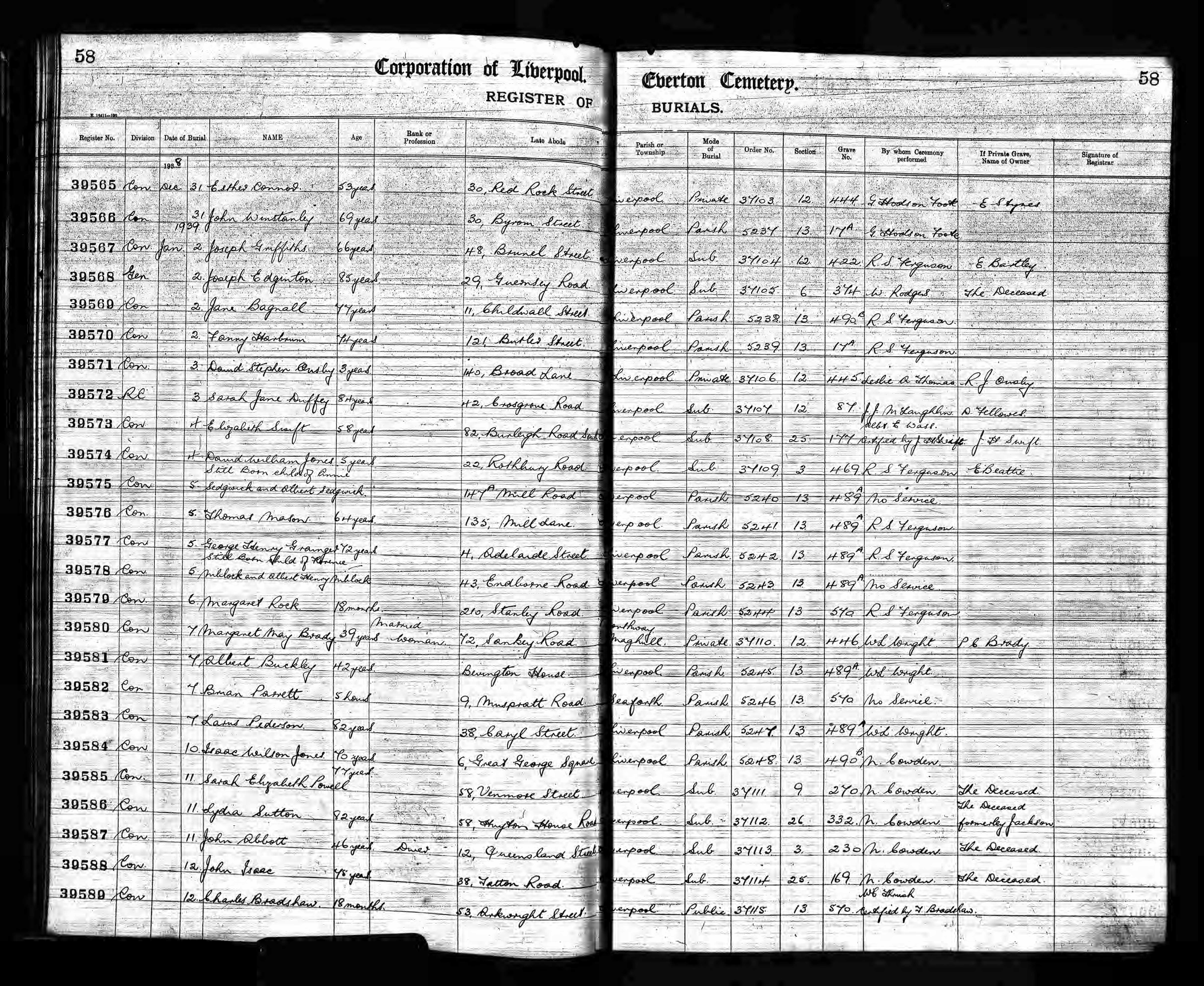 She died 8 Jan 1939, 58 Huyton House Rd, age 82 yrs.