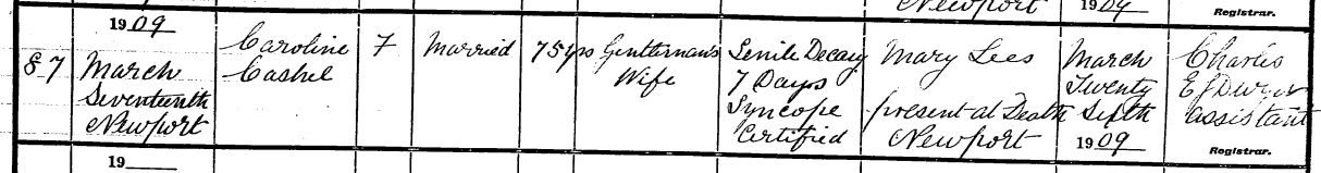 died weeks later, 19 Apr 1909, Newport, Co.Tipperary.
