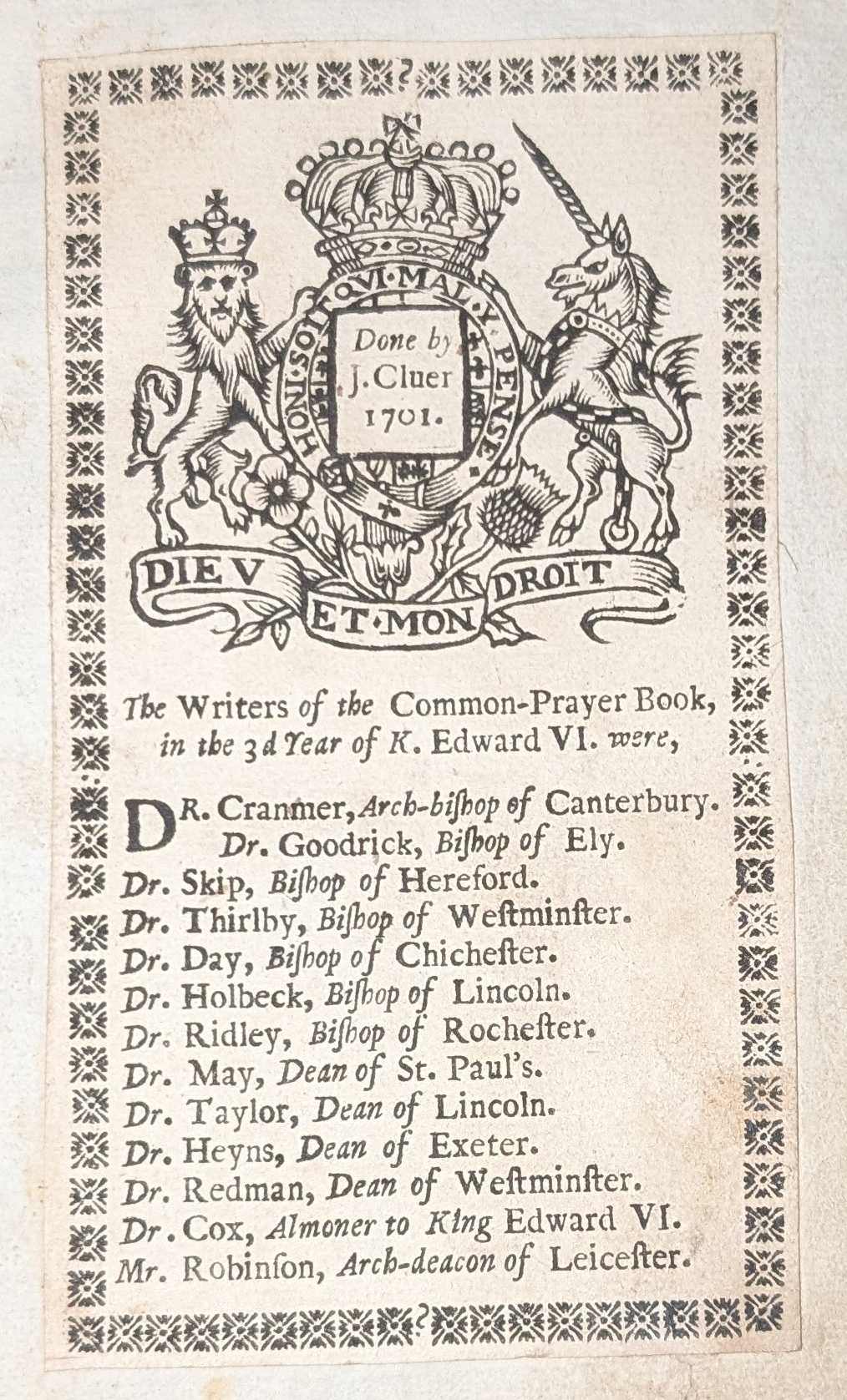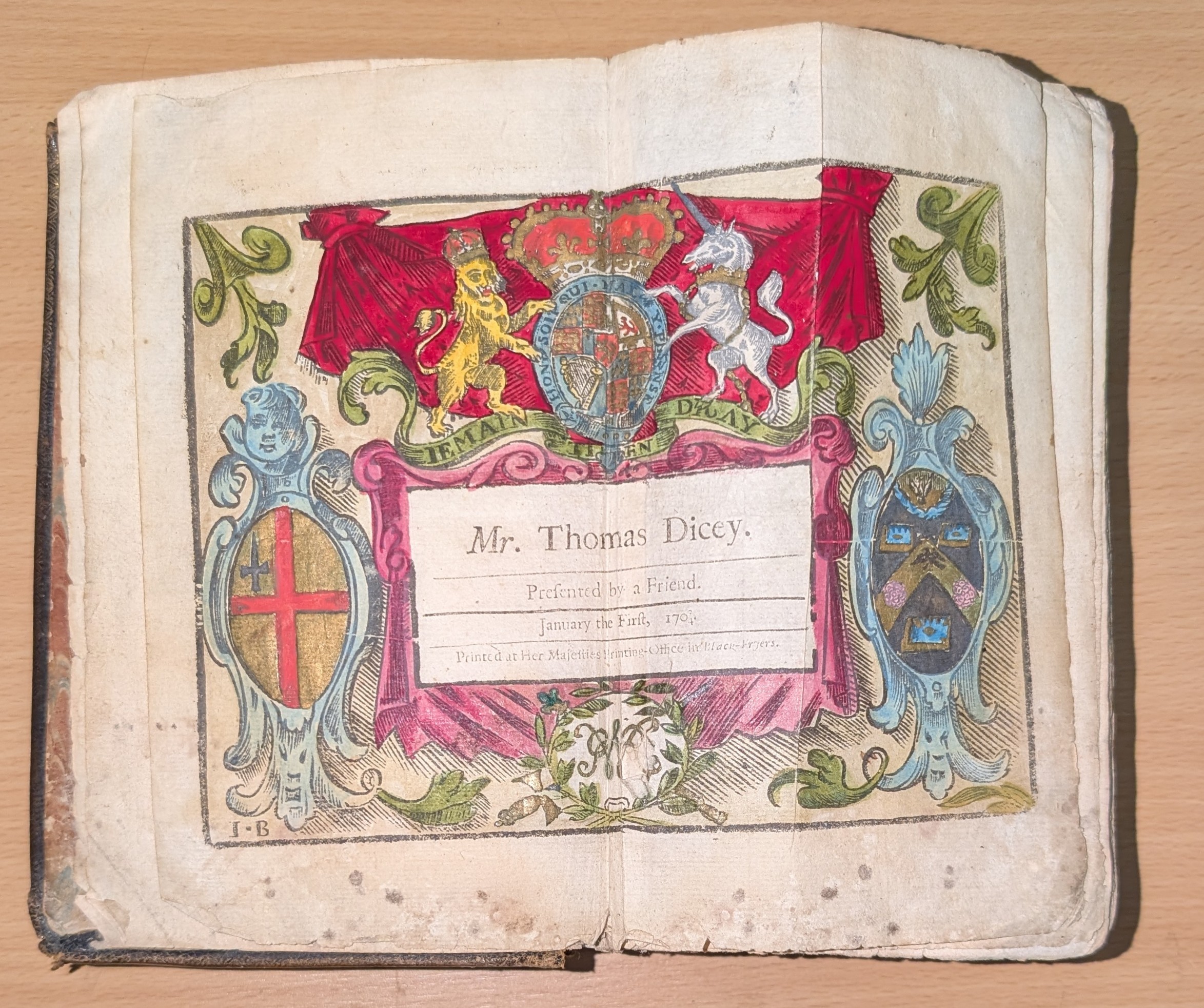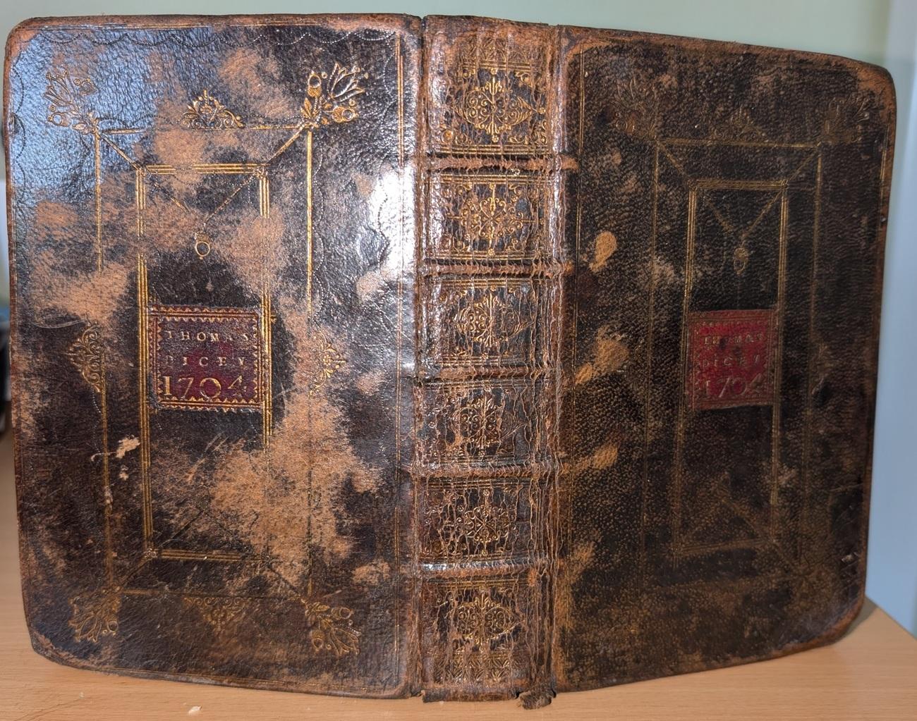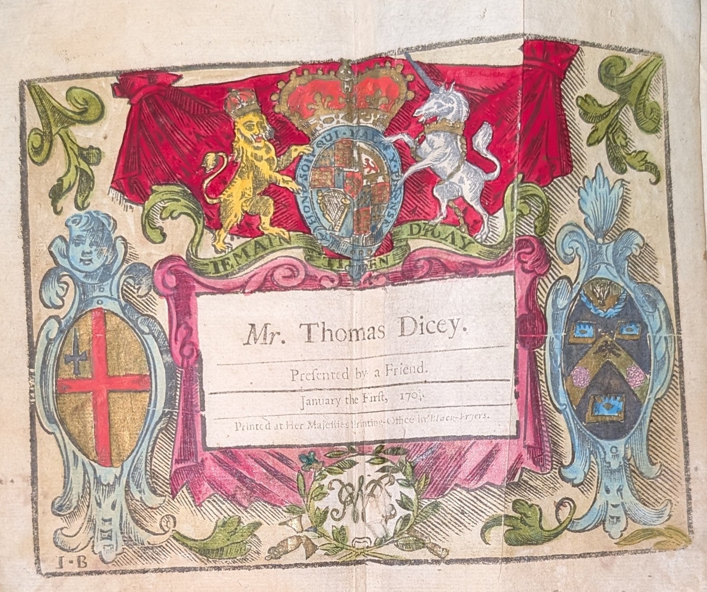 The book is presented to "Thomas Dicey" by "a friend" on 1 Jan 1704 (new style year).