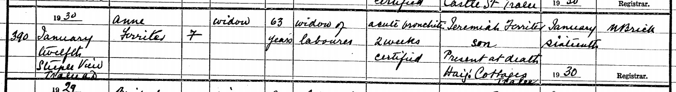 She must be Anne Ferriter, widow of a labourer, who died 12 Jan 1930, Steeple View, Brogue Lane, Tralee.