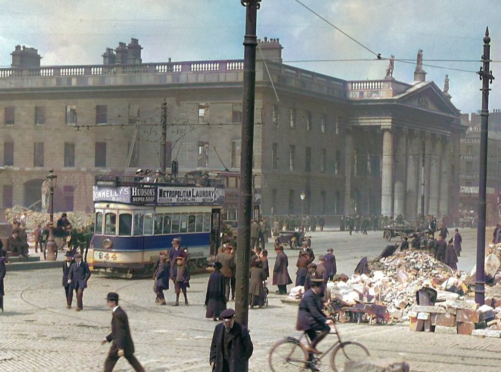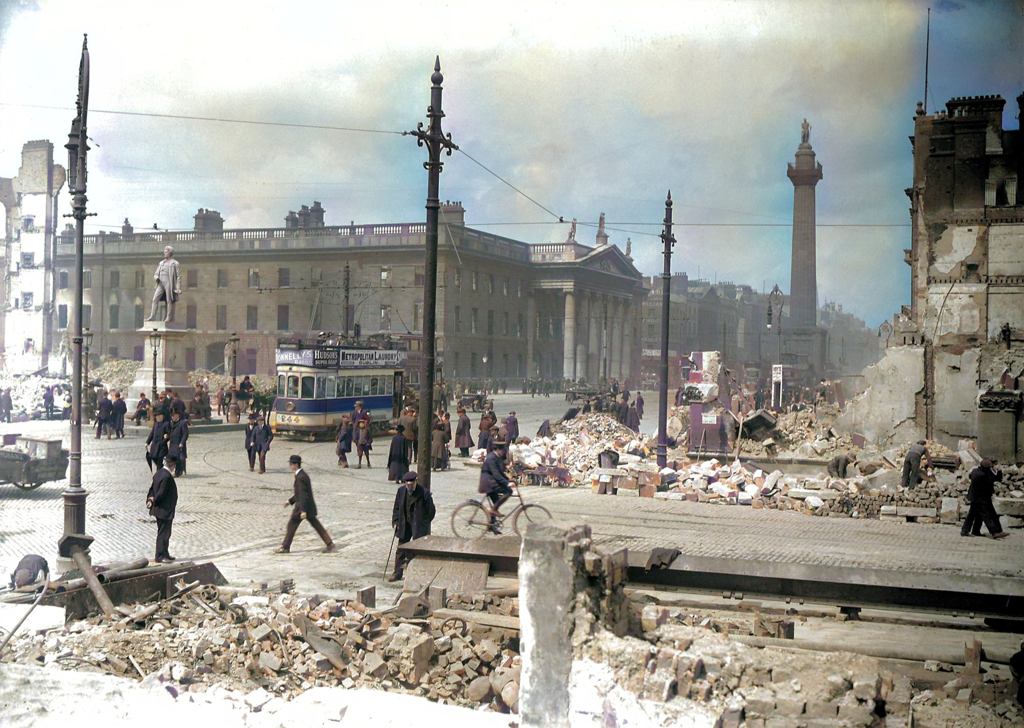 Donnelly's ad on tram on Sackville St in aftermath of 1916 Rising.