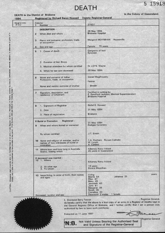 - Entry for Margaret Moynihan (died 1894) in Nudgee burial register, book 11, p.117.