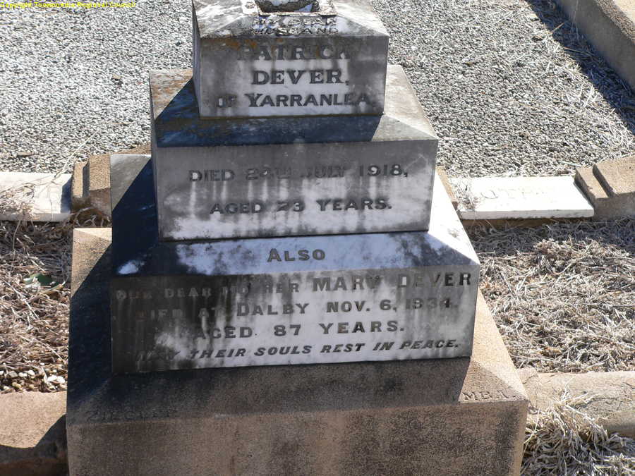 Patrick died at Yarranlea, 24 July 1918, age 73 yrs [grave], or 72 yrs,