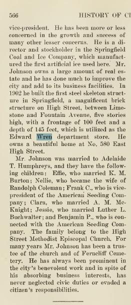 dau of James Kinnane, boot and shoe maker, of Co.Tipperary]. She is listed as of Tarbert at marriage. They emigrated to the US, landed New York. Arrived in US on 1 Sept 1873 [obituary]. Moved first to Lancaster, Ohio, there as at 1874. He started dry goods business with a partner. Partner took over this business. He settled in Springfield, Ohio, in 1877 [obituary]. He started dry goods business with his Kinnane in-laws as partners 1877, Kinnane and Wren, South Limestone St, Springfield, Ohio. He ran successful dry goods business and general store, became very wealthy. He built a residence, "Mount Pleasant", North Limestone Street, Springfield, Ohio (built by 1885). The partnership with the Kinnanes dissolved in 1892. He set up as the "Edward Wren Company", South Limestone St, Springfield, Ohio.