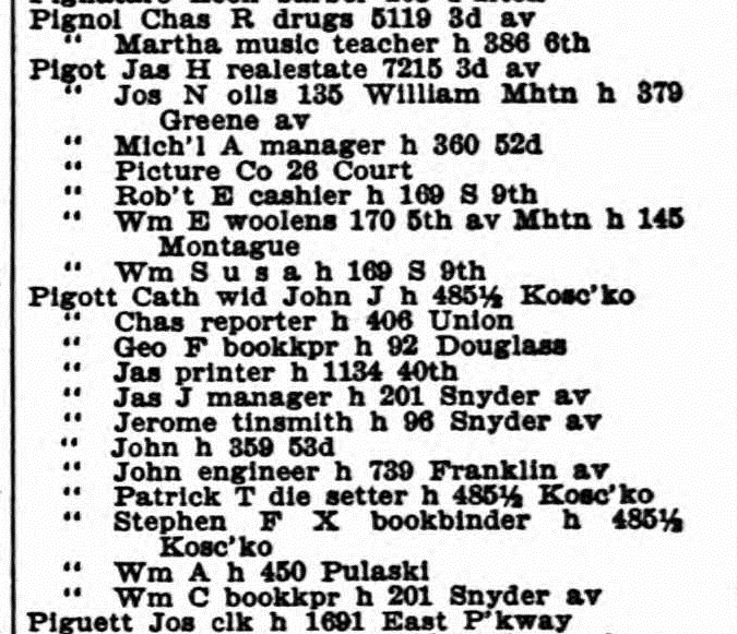 Patrick T. Pigott, "diesetter", at home with mother at Kosciuszko St, Brooklyn, in 1904 Brooklyn Directory.