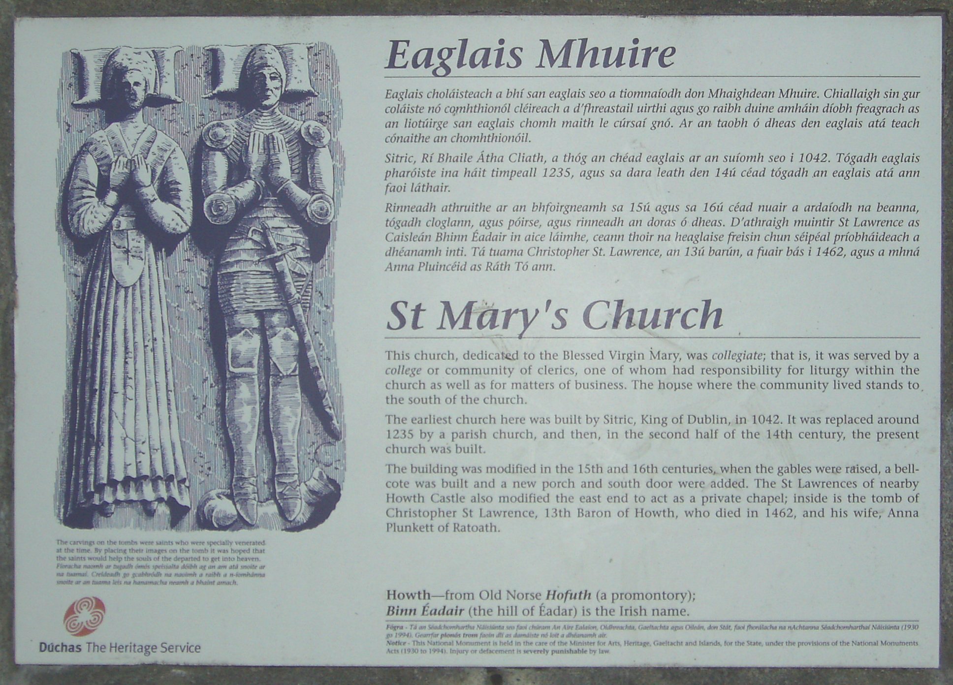 "Among the monuments is one of marble to Christopher, 13th baron of Howth, and his lady, whose effigies are still entire,