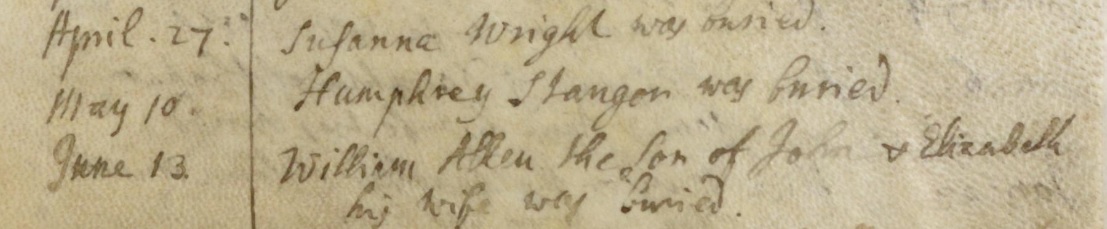 the burial of Mary Stanger, daughter of Humphrey Stanger and Mary his wife,