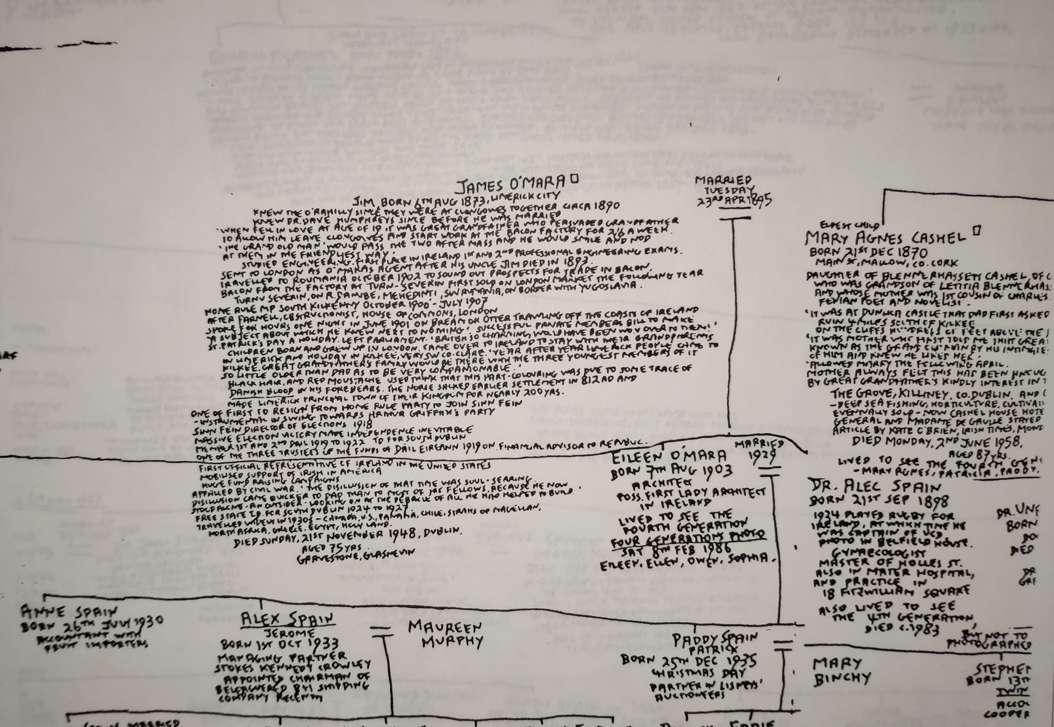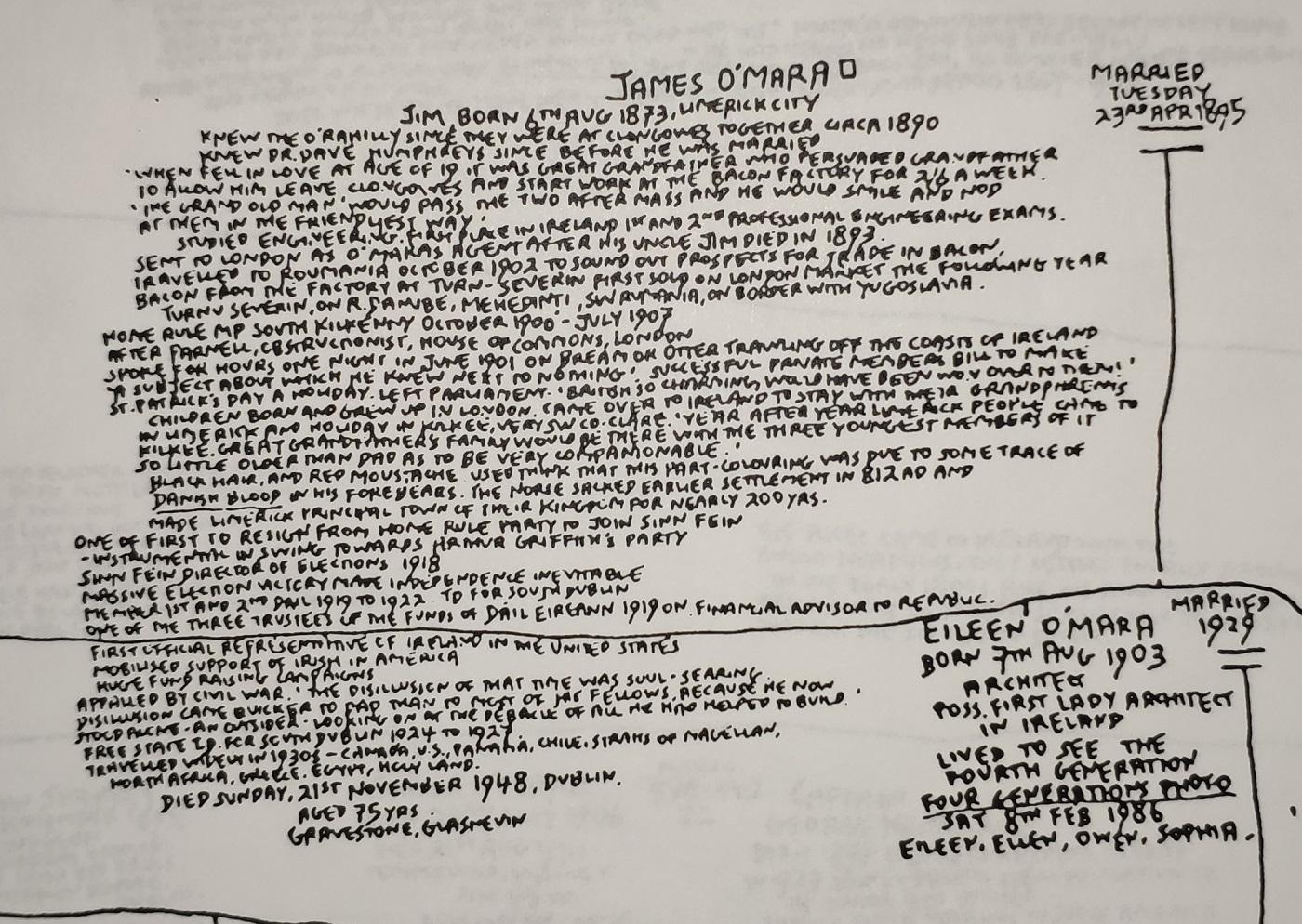 My hand-drawn family tree in 1983 to 1989, showing James O'Mara.