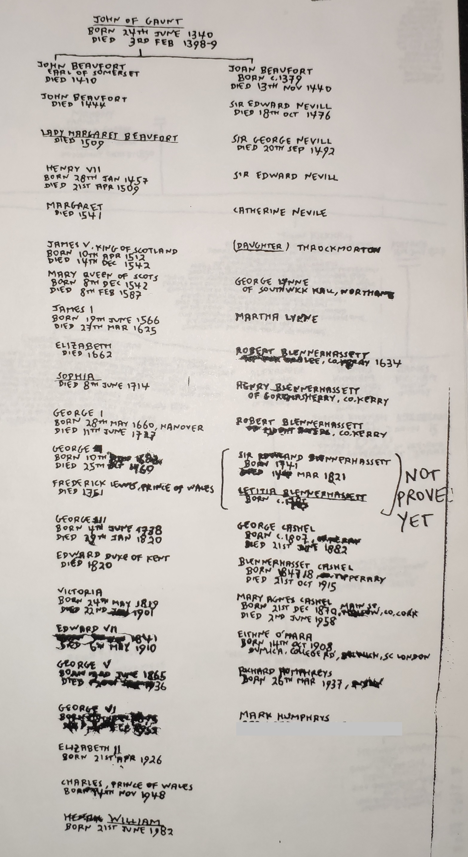 Edward III (born 1312) | +--------------+----------------------------------------+ | | John of Gaunt (born 1340) Edmund Plantagenet (born 1341) | | Joan Beaufort (died 1440) Constance Plantagenet (died 1416) | | +----------+-------------------------------+ Isabel le Despencer (born 1400) | | | 1st Earl of Salisbury (born 1400) 3rd Baron Abergavenny Elizabeth Beauchamp (born 1415) | | | Alice Neville +----------+------------+ | | Elizabeth Fitz-Hugh 4th Baron Abergavenny (born 1440) | | Catherine Vaux (died 1571) Sir Edward Neville (died 1538) | | Clement Throckmorton (died 1573) Catherine Neville | | +--------------+--------------------------------------+ | Martha Throckmorton (born 1551) | George Lynne (died 1606) | Martha Lynne (probably bapt 1598) == John Blennerhassett (died 1676) | poss. descendant of Henry I | Robert Blennerhassett == Avice Conway (died 1683) | poss. descendant of Edward III | Henry Blennerhassett (died before 1728) | Robert Blennerhassett (died 1765) == Frances Yielding | Documents say George Cashel descends from the Robert Blennerhassett family. DNA says he descends from both Blennerhassett and Yielding. So he must descend from this marriage. So Robert must be ancestor of (almost certainly great-grandfather of): | George Blennerhassett Cashel (born 1807) | Blennerhassett Cashel (born 1848) | Agnes Cashel (born 1870) | Eithne O'Mara (born 1908) | Richard Humphreys (born 1937) | Mark Humphrys == Elizabeth Gibbon descendant of Edward III